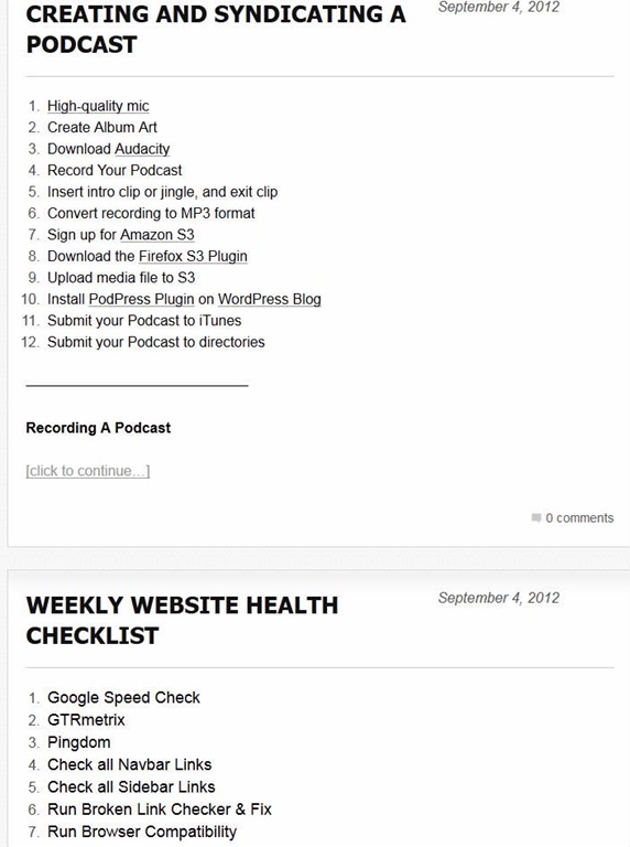 - NOW the biggie. Create and Use an internal blog that acts as a repository for all systems, processes, and procedure. Some recommend utilizing a Wiki. I personally just use a WordPress blog which isn’t indexed.